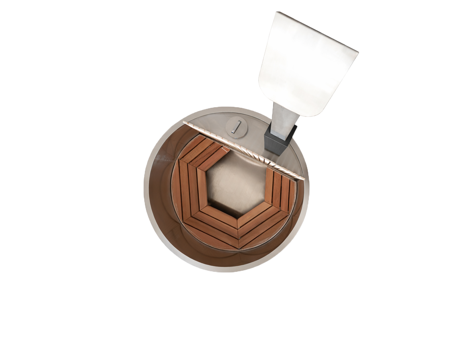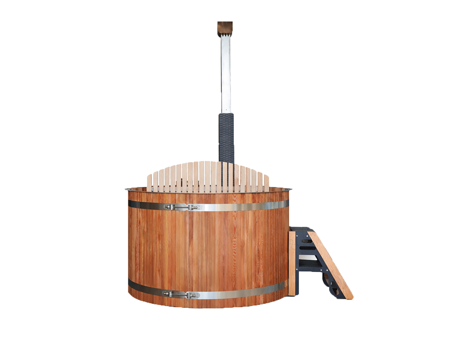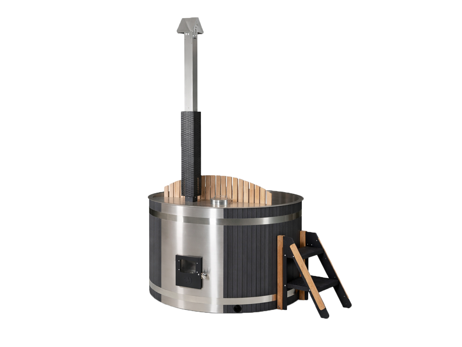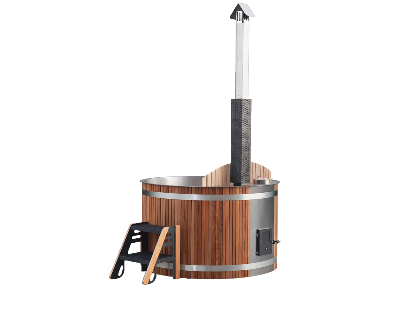 Оснащение: вкладыш из нержавеющей стали 304 (толщина 1,5 мм), поверхность из ПВХ, скамья из красного кедра (толщина 40 мм), топка печи из нержавеющей стали (толщина 2 мм). Особенности: