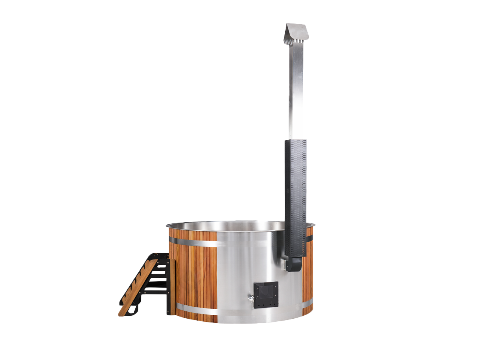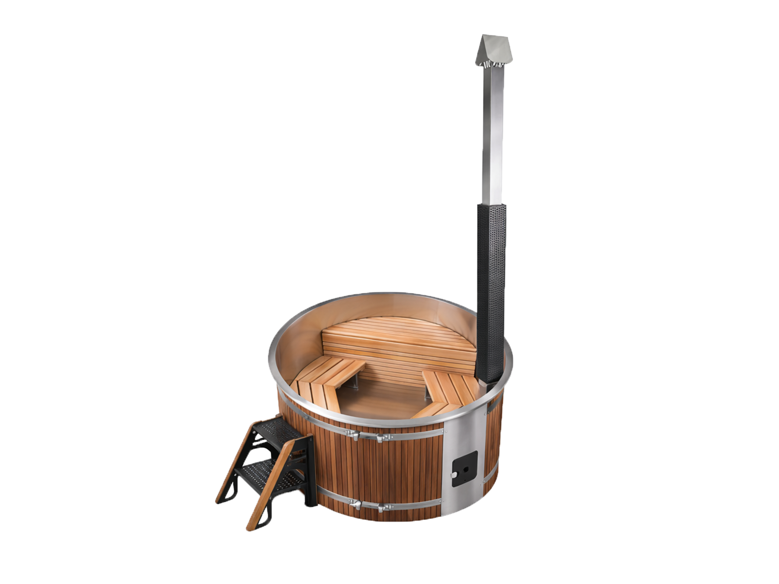 Оснащение: вкладыш из нержавеющей стали 304 (толщина 1,5 мм), поверхность из ПВХ, скамья из красного кедра (толщина 40 мм), топка печи из нержавеющей стали (толщина 2 мм). Особенности: