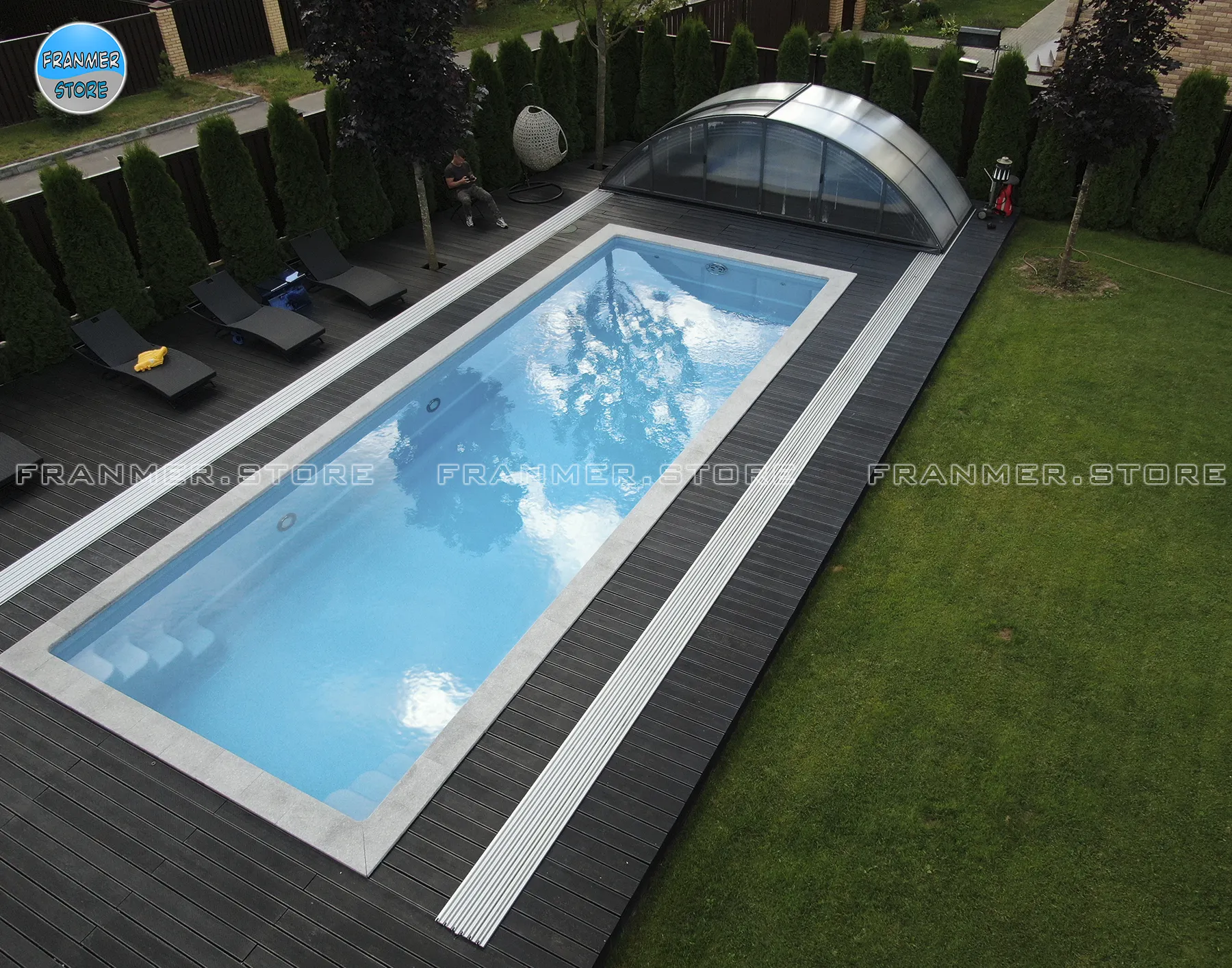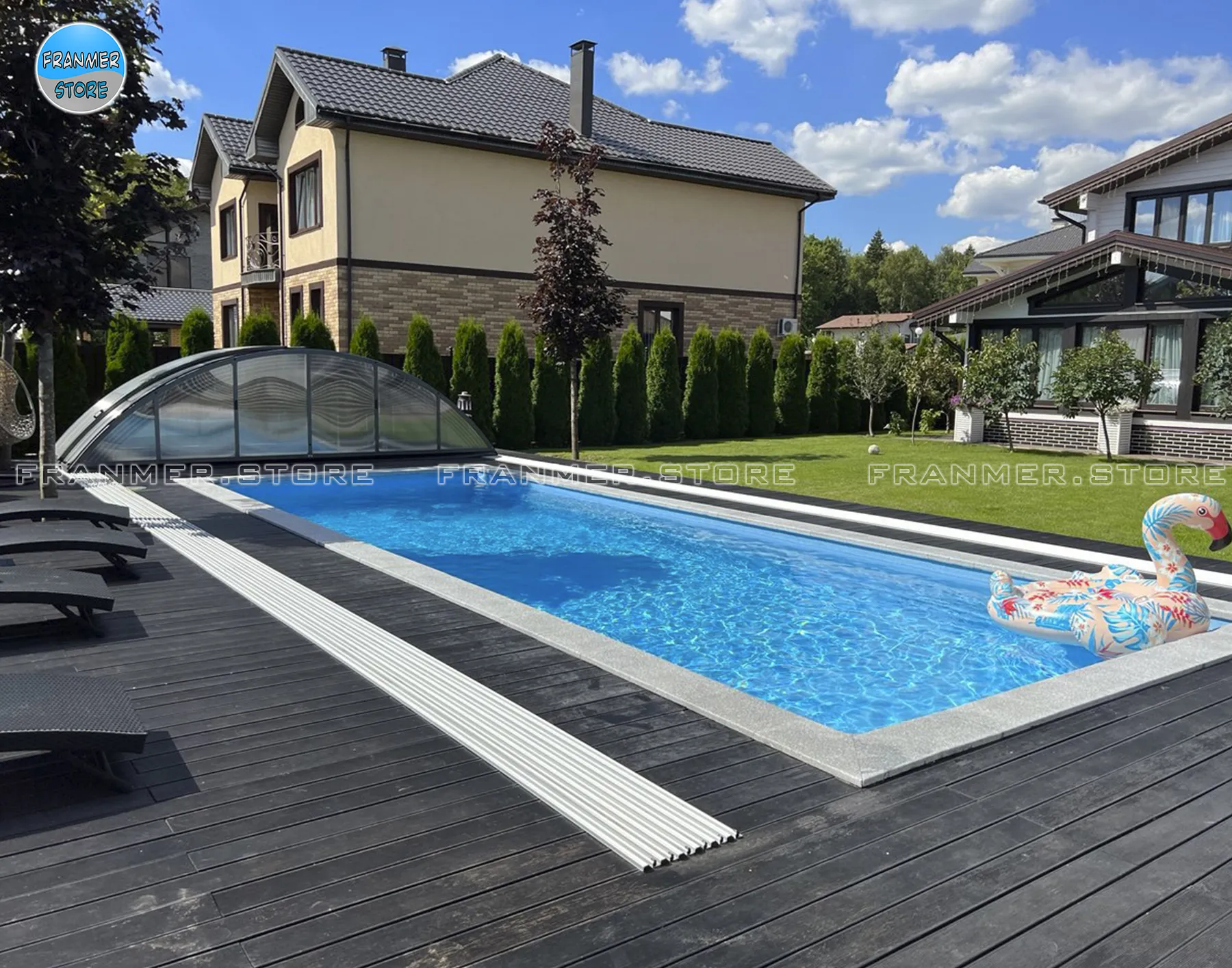 Павильон для бассейна "Арка" имеет классическую полукруглую форму и состоит из нескольких отдельных секций по размеру меньше одна другой. Каждая секция имеет прочные колёса, которые устанавливаются на направляющий профиль из алюминия (рельсы). Двигая секцию в нужном направлении можно без труда открывать или закрывать поверхность бассейна. В зависимости от размера водной глади и других задач, ширина и высота павильона варьируется. Каркас секции формирует прочный профиль из алюминия, цвет каркаса можно выбрать из таблицы образцов Ral. В качестве остекленения используется сотовый или монолитный поликарбонат.
