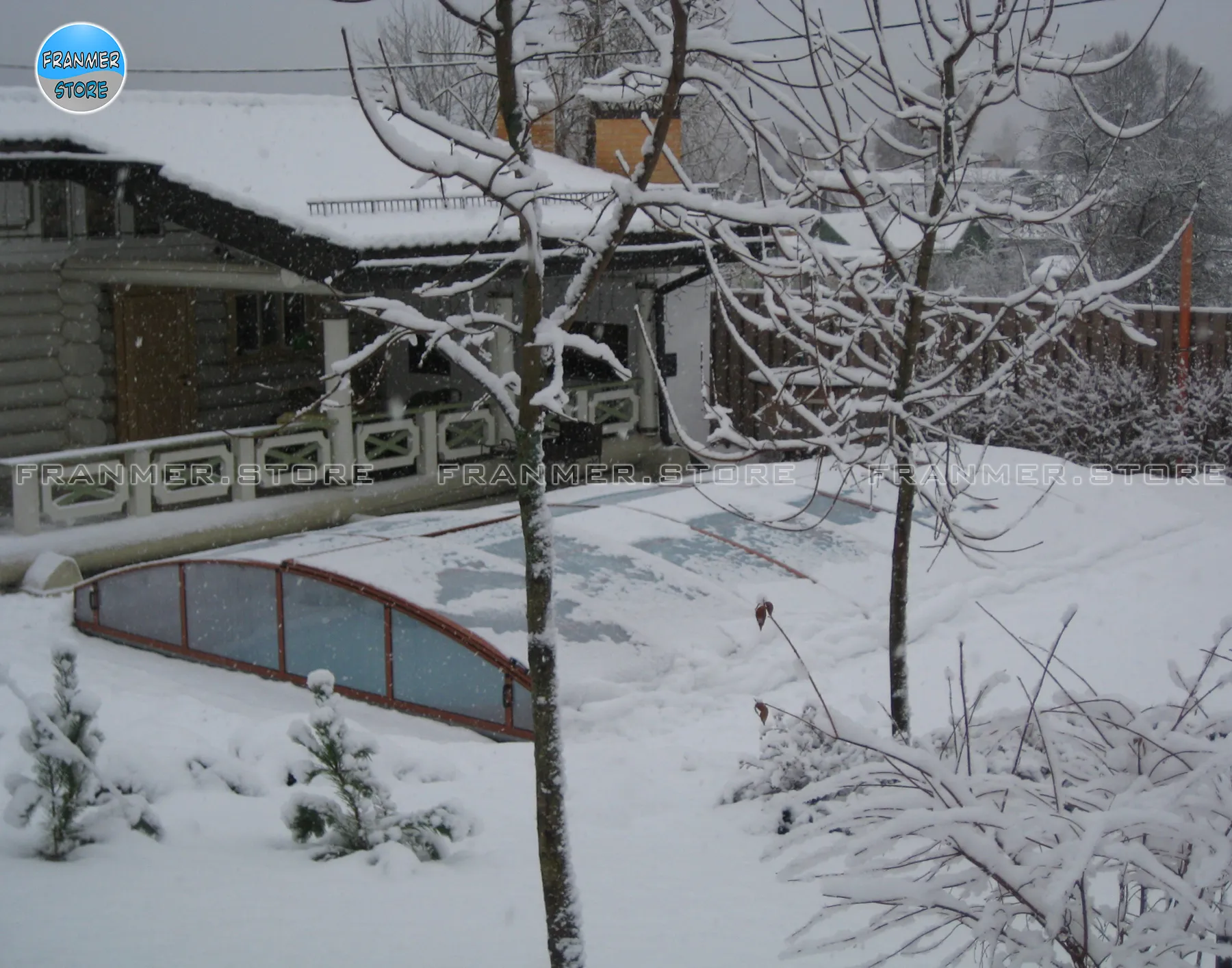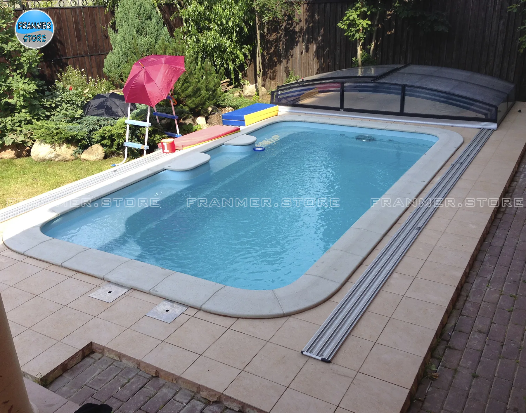 Павильон для бассейна "База" имеет самую низкую высоту среди всех представленных моделей марки "nordPOOL". Конструкция состоит из нескольких отдельных секций по размеру меньше одна другой. Каждая секция имеет прочные колёса, которые устанавливаются на направляющий профиль из алюминия (рельсы). Двигая секцию в нужном направлении можно без труда открывать или закрывать поверхность бассейна. В зависимости от размера водной глади и других задач , ширина и высота павильона варьируется. Каркас секции формирует прочный профиль из алюминия, цвет профиля можно выбрать по таблице Ral. В качестве остекленения используется сотовый или монолитный поликарбонат.