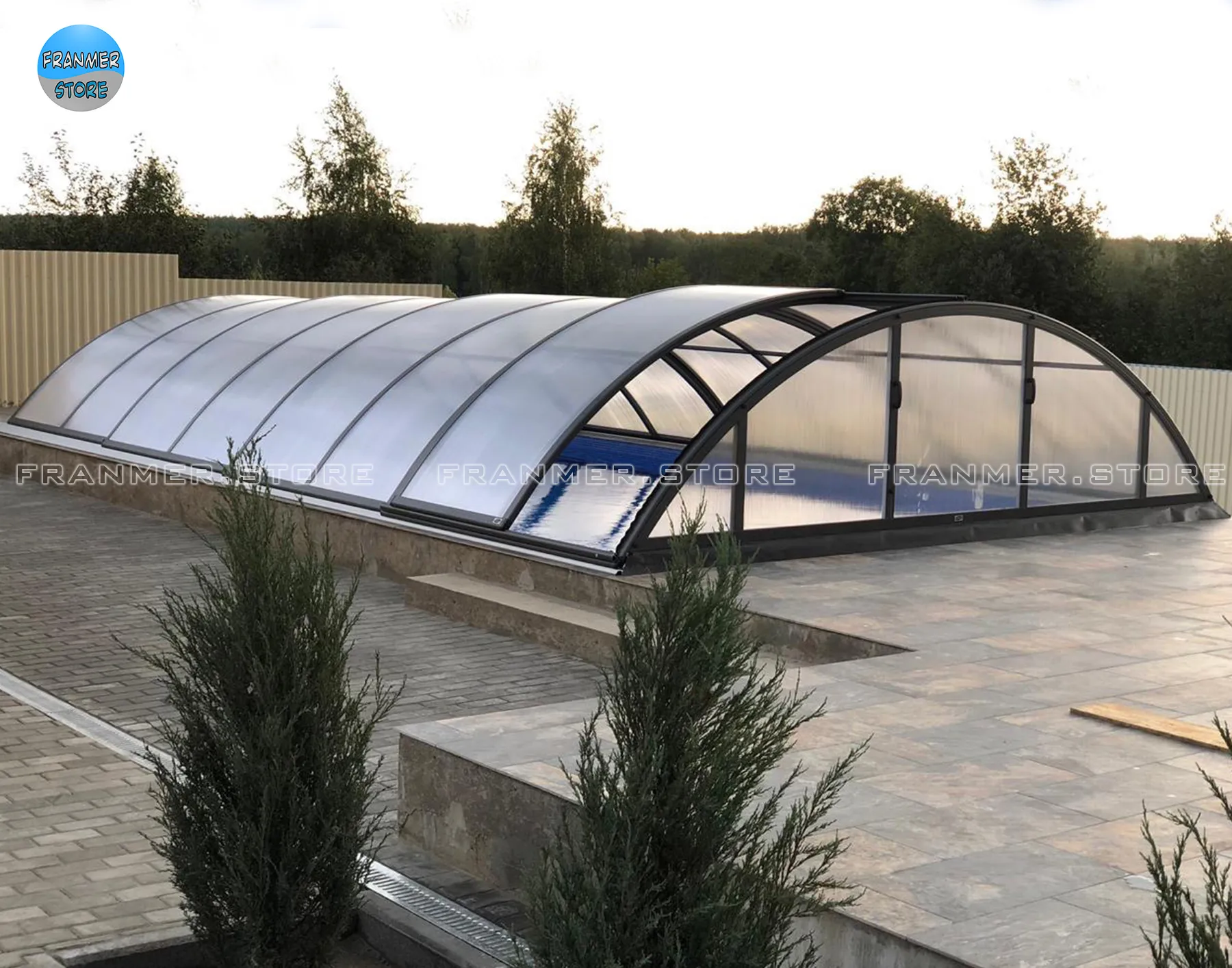 Павильон для бассейна "Арка" имеет классическую полукруглую форму и состоит из нескольких отдельных секций по размеру меньше одна другой. Каждая секция имеет прочные колёса, которые устанавливаются на направляющий профиль из алюминия (рельсы). Двигая секцию в нужном направлении можно без труда открывать или закрывать поверхность бассейна. В зависимости от размера водной глади и других задач, ширина и высота павильона варьируется. Каркас секции формирует прочный профиль из алюминия, цвет каркаса можно выбрать из таблицы образцов Ral. В качестве остекленения используется сотовый или монолитный поликарбонат.