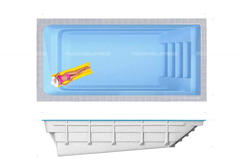 "Марсель" композитный бассейн класса Премиум. Изготавливается из спец. сырья эталонного качества. При производстве бассейна применяются такие технологии, как: <Power Lock>™ (каркас из массивных ребер жесткости) и <Carbon Systems>™ (усиление наиболее уязвимых частей бассейна карбоновым волокном).Толщина стенок 1-1,2 см. Толщина декоративного слоя 1-1,2 мм. Заводская гарантия на целостность бассейна 35 лет, на декоративный слой из гелькоута 10 лет. Бассейн предназначен для установки на улице, в помещении, в цокольных этажах, на крышах зданий. Доставка осуществляется на спец.прицепе с длинной рамой.